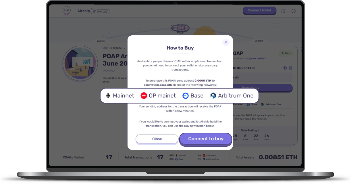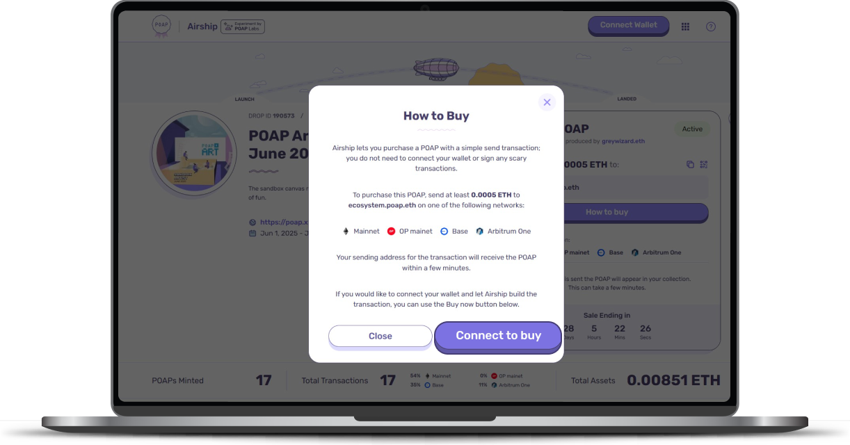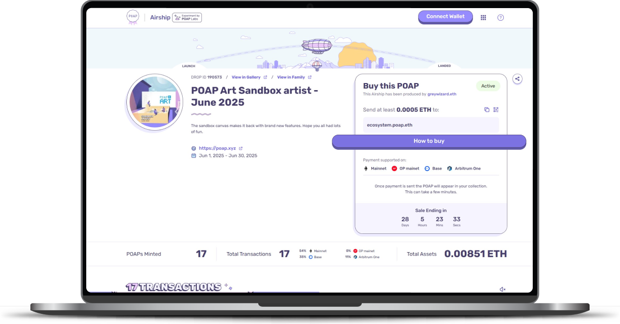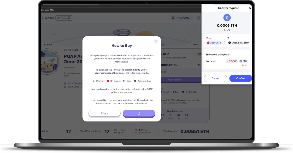 POAP Airship allows you to receive a POAP automatically when you make a qualifying transaction on-chain. If an issuer is using Airship, it means they’ve set up a special way to thank participants like you with a precious digital collectible just for taking action.