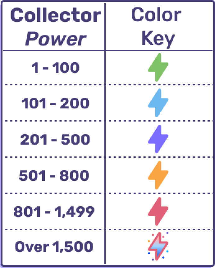 Each collector power ranking is represented by a lightning bolt icon . These lightning bolts have various colors based on the collector power.