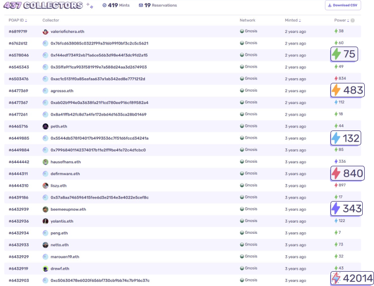 The POAP power of a specific POAP collector is calculated as the sum of all POAPs held by a single collector.